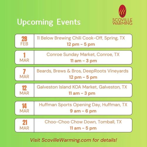 Check for updates to our Events schedule to find Scoville Warming at pop-up sampling events, markets, and festivals.